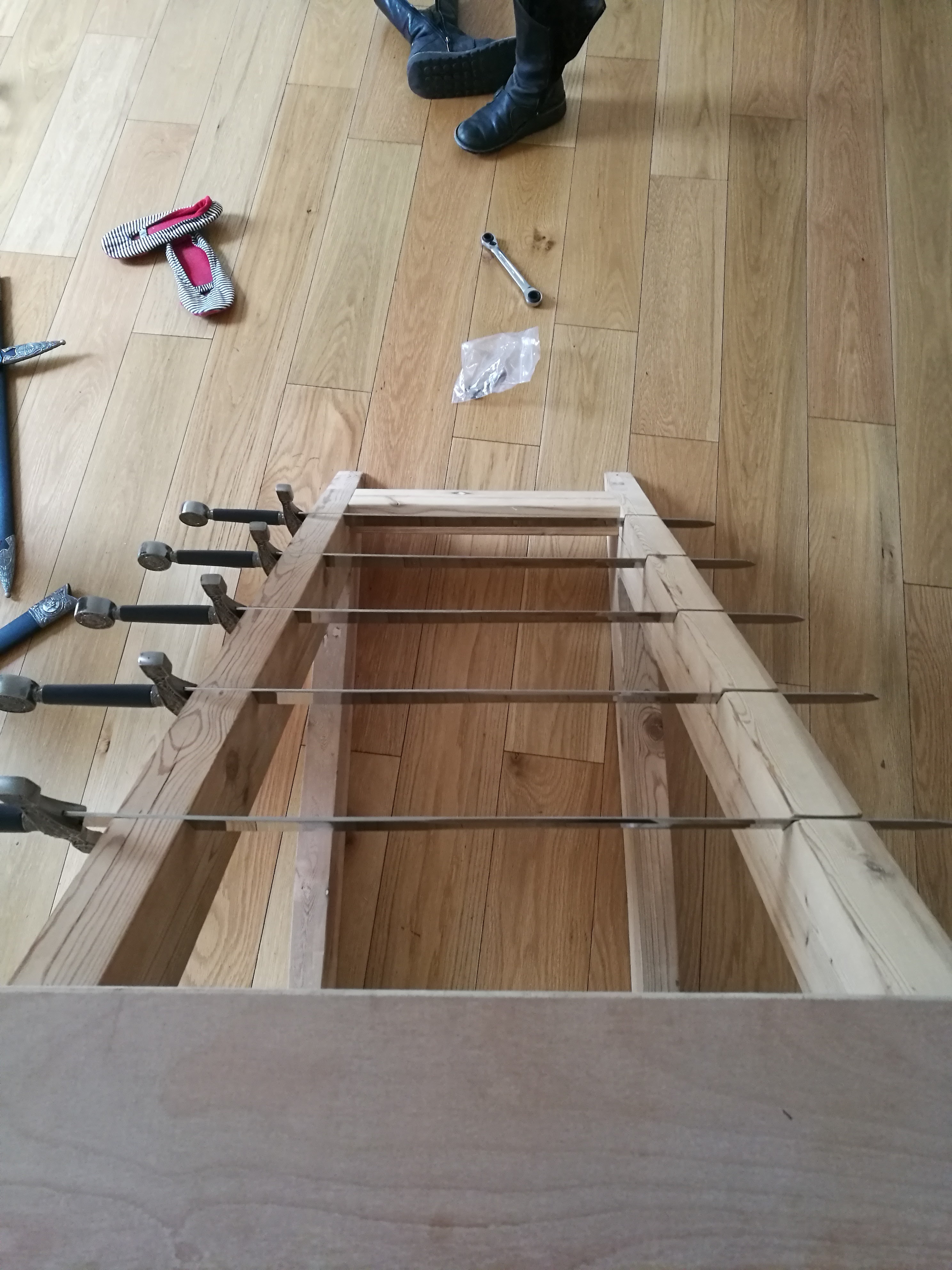 Last year I was commissioned by Oh Carolina, a burlesque performer to make her a sword ladder. It had to have 5 rungs for 5 ladders and be collapsible for transport.